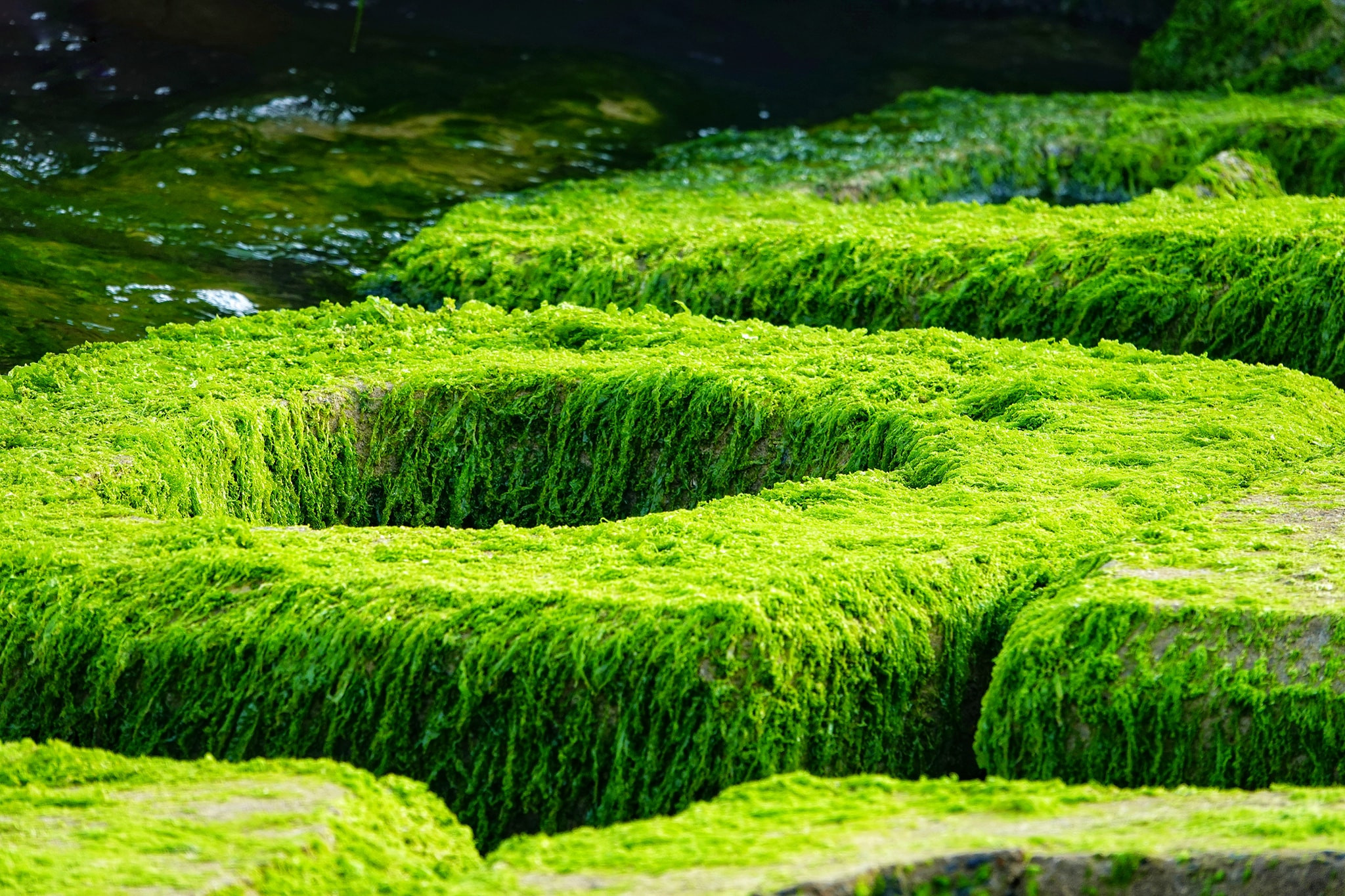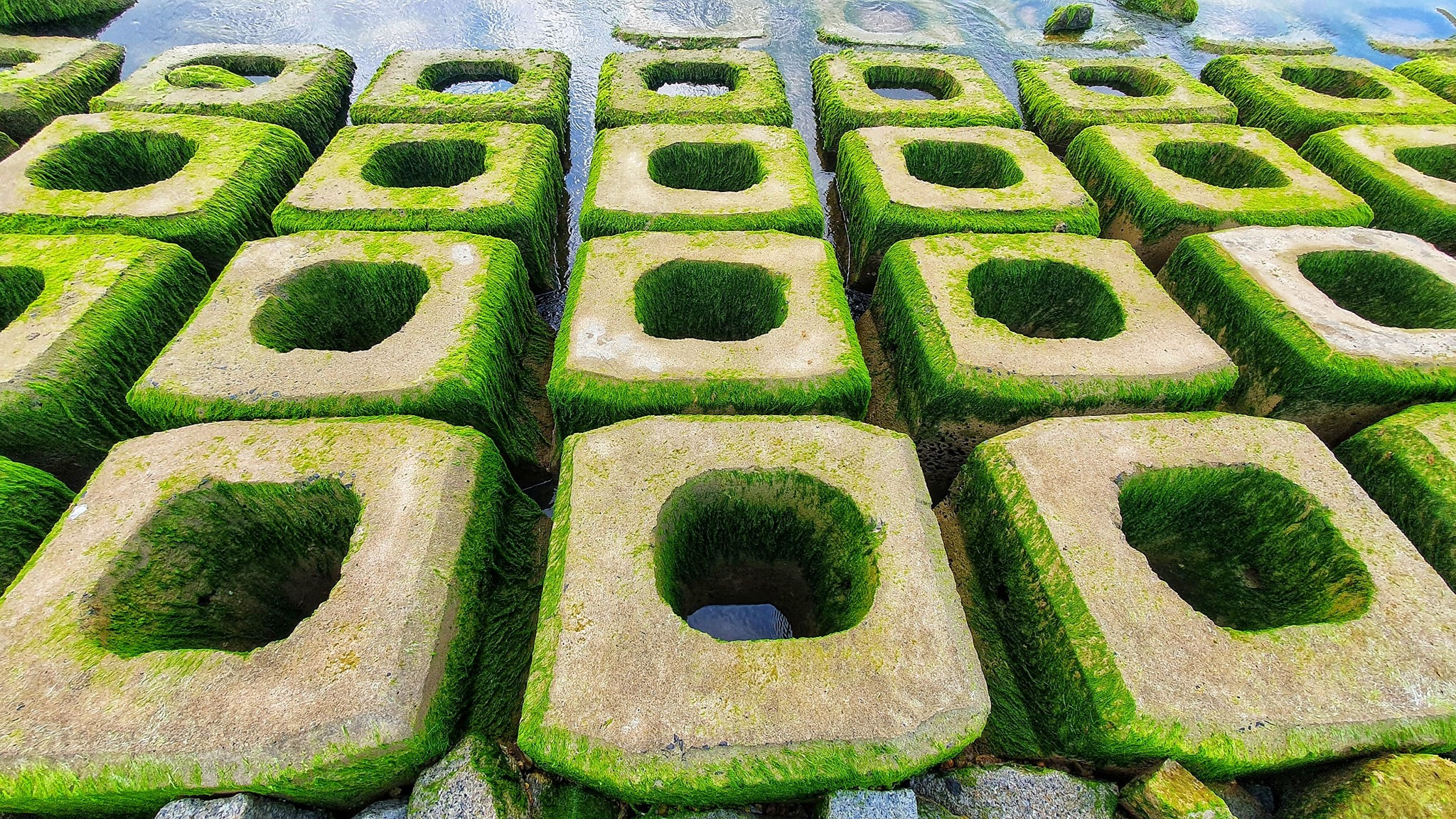 Vá»›i dải rêu xanh lá trải dà i theo địa pháºn được tạo nên bởi những tảng bê tông vuông và những tảng đá đủ kÃch thước tạo thà nh bá» kè vững chãi. Những loại rêu ở đây bán chặt và o đá và o những tảng bê tông nổi lênh đênh theo dòng nước, và má»—i khi thá»§y triá»u rút để lại những đốm rêu bao bá»c lấy những tảng đá. Tùy và o ánh nắng mặt trá»i và thá»i gian các loại rêu ở đây có mà u sắc biến đổi khi xanh non, khi trắng bạc khi thì xanh Ä‘áºm đúng chất rêu.
